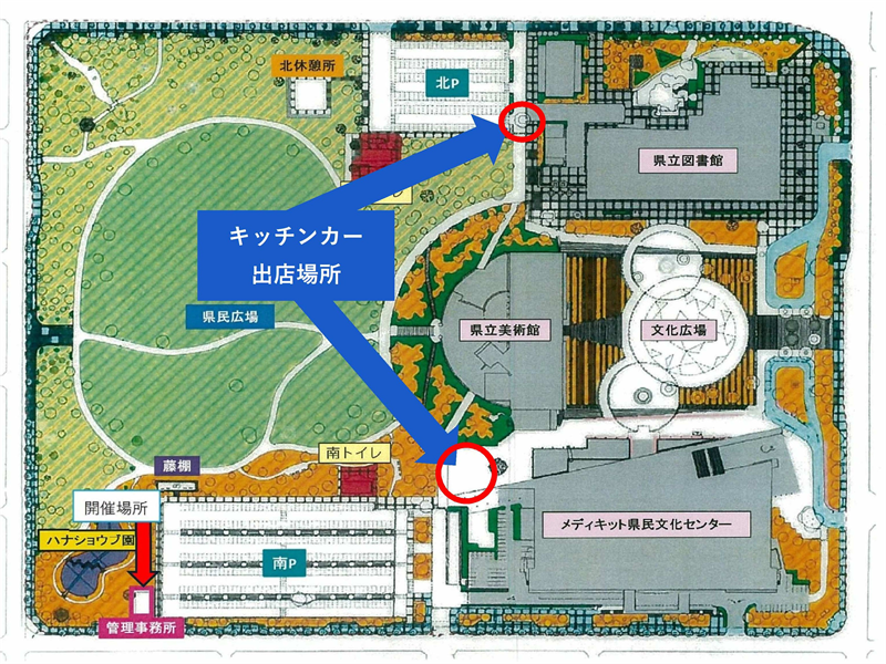 ・出店場所 宮崎県総合文化公園内 北駐車場・南側広場 1日各1台(南側の場合は鍵が必要なため当日管理事務所までご連絡ください)